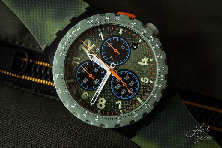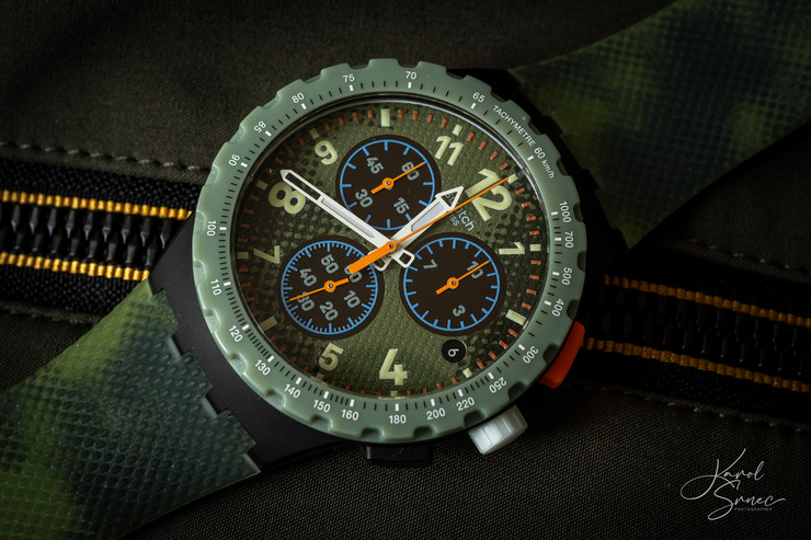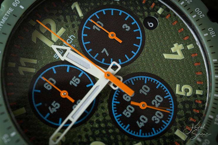 Nikon má v ponuke APS-C základný objektív, ktorý výborne zvláda aj fotografovanie detailov. Takmer v ekvivalentnej mierke 1:1, čo považujeme za pravé makro. Otestovať túto jeho prednosť, vzhľadom na to, že jar ešte neprišla, som sa rozhodol na mojich hodinkách Swatch. Použil som rovnaký recept, ako v siedmom stĺpčeku, kde som fotil nožíky Victorinox. Ako pozadie som zvolil ďalšiu z mojich búnd a využil svetlo od balkónových dverí.