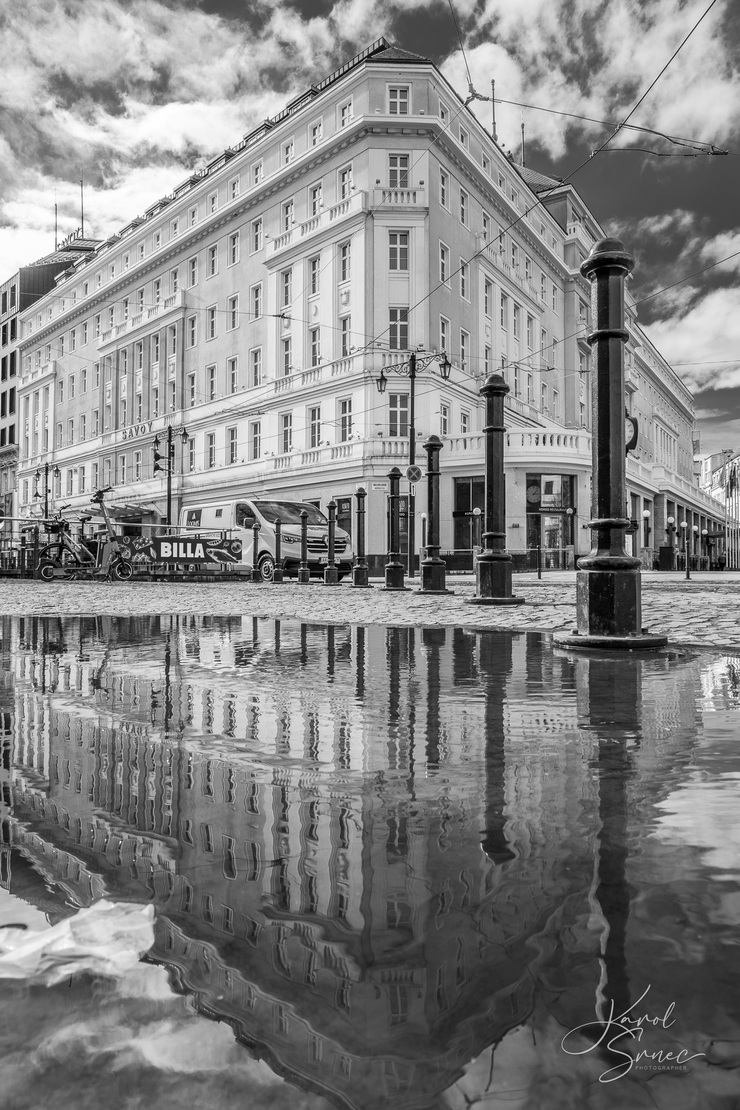 Keď sa v meste roztopil posledný sneh, vyrazil som testovať objektív NIKKOR Z DX 16-50/2,8 VR. Využil som mláky, ktoré po snehu ostali a fotografoval som s využitím odrazov. Pomohlo mi, že Nikon Z50 II má otočný displej. Fotoaparát som mohol dať až takmer na hladinu a natočiť k sebe displej, aby sa mi ľahko komponovalo.