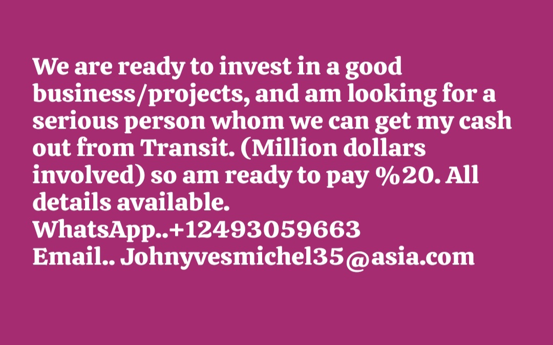We are ready to invest in a good business/projects, and am looking for a serious person whom we can get my cash out from Transit. (Millions involved) so am ready to pay %20. All details available.