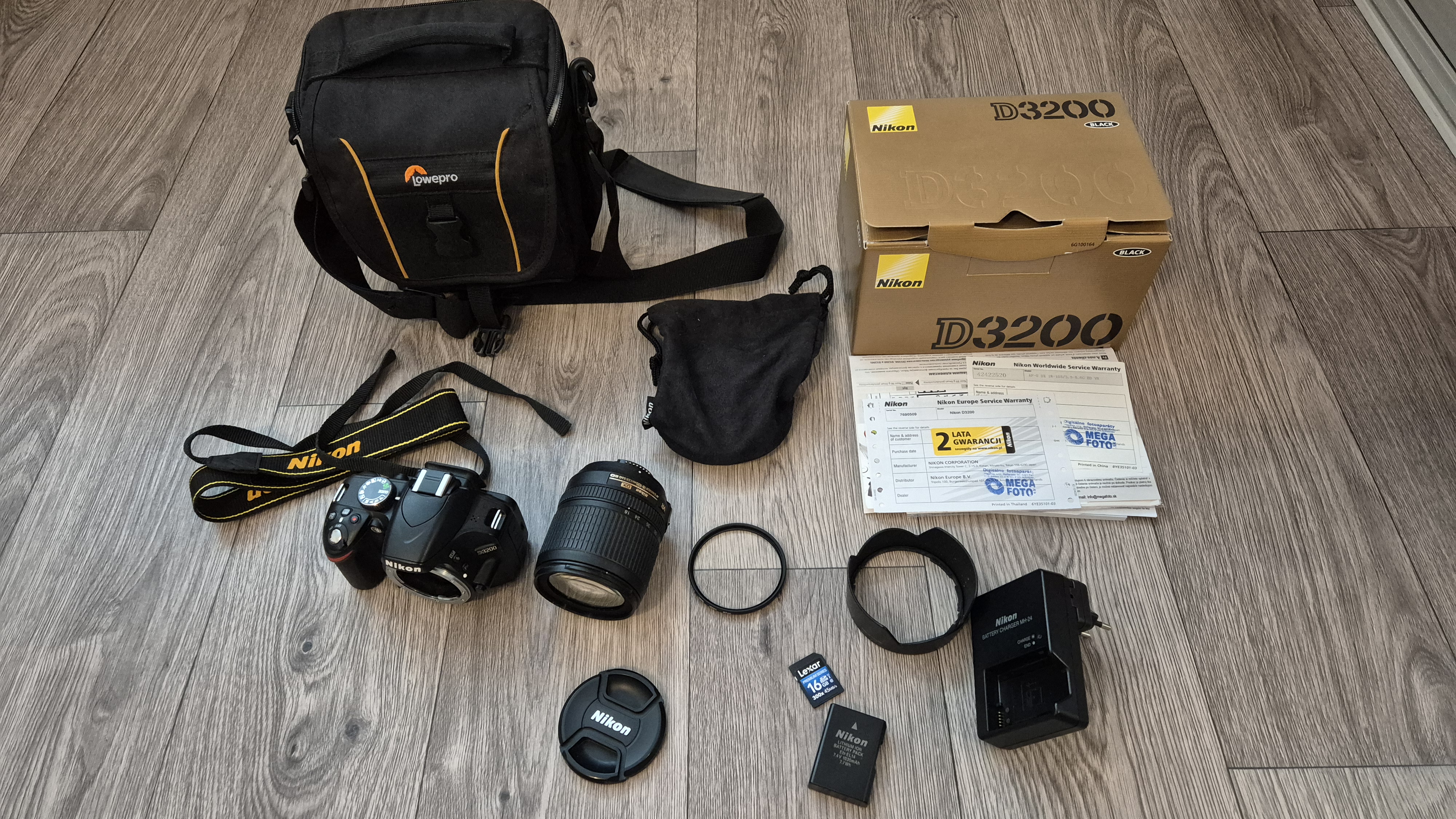 Predám fotoaparát Nikon D3200 s objektívom Nikkor 18-105 VR a príslušenstvom (uv filter HOYA 67mm, slnečná clona Nikon HB-32, brašna, 1x baterka, nabijacka, ....). Foták v TOP stave v originál krabici, minimálne používaný.