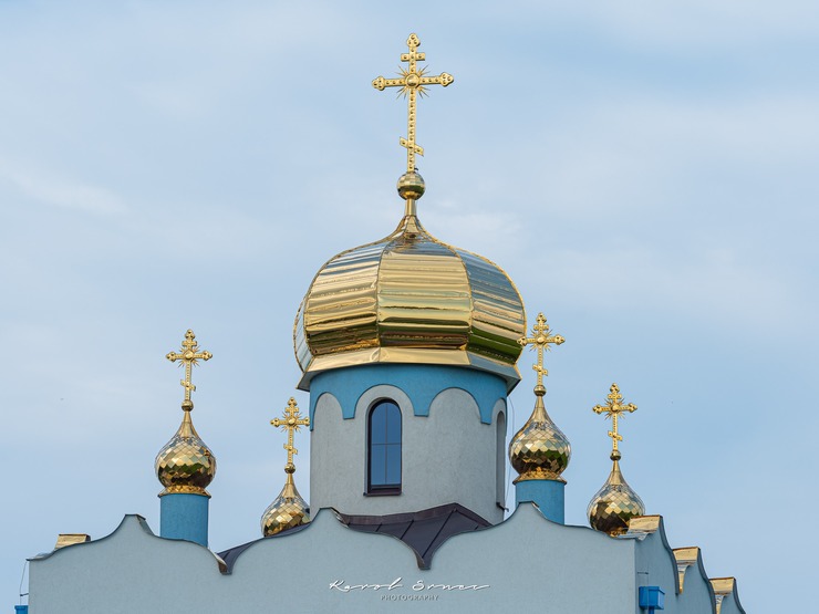 Pravoslávny kostol je moderný a jeho zlaté strechy sa blýskajú do diaľky. Je len pár sto metrov od veterného mlyna.