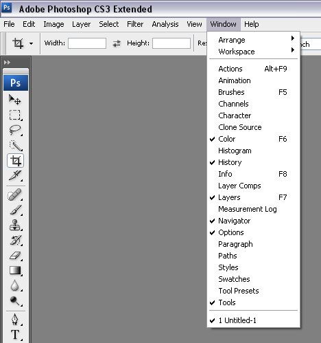 Vidíme, že niektoré možnosti sú v oknách "zašedené", t.j. že na ne nemôžeme kliknúť. Je tomu tak preto, že určité funkcie je možné použiť iba pre určité nástroje. Napríklad funkcia Check spelling zo záložky Edit je nám zbytočná (t.j. automaticky "zašedená") pokiaľ momentálne nepracujeme s textom.