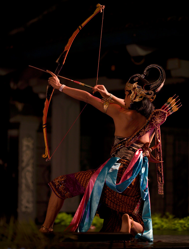 Asi nie Amor, ale nejaká iná postava v Rámajáne (mýtické príbehy v Infonézii). Príbehu, ani textom sme veľmi nerozumeli, tak sme si aspoň užívali zaujímavé farebé výstúpenie s nie veľmi ľúbozvučným hudobným sprievodom (gamelan). Ak by som nemal fotoaparát, asi by som mal problém obsedieť tam 2 hodiny, našťastie nebol problém sa presúvať okolo javiska aj počas predstavenia, len si bolo treba dávať pozor, aby som nebol v smere paľby (tie šípy naozaj lietali).