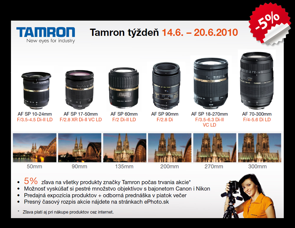 Počas celého týždňa od 14.6. do 20.6.2010 môžete v ephotoshope využiť 5% zľavu na všetky objektívy značky Tamron*.