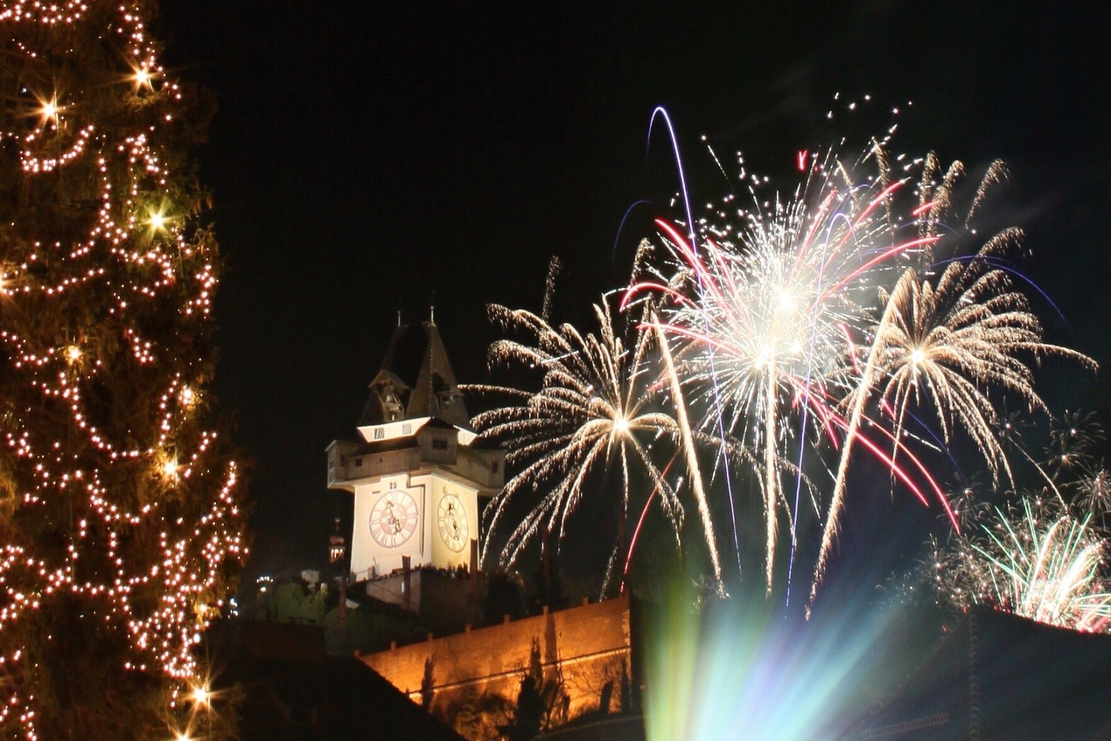 Na namesti v Grazi bol krasny stromcek so Schlosbergom v pozadí